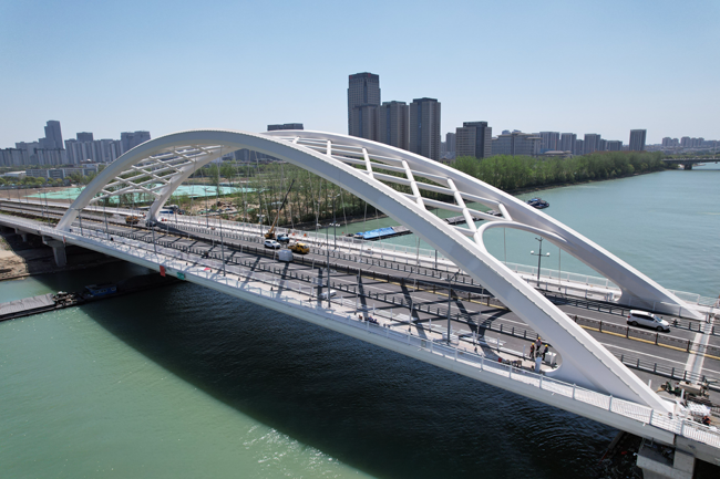 集团承建的二里桥路跨京杭运河节点工程(曲江大桥)项目连续上跨滨河西路、京杭运河、东外滩路(规划),主桥采用“钢箱提篮拱”结构,由拱肋和交织的横撑组成,相依相靠,形成稳定结构。设计灵感源自扬州“月亮城”的文化意象。侧观桥体,两向内收拢的拱肋形如弯月,网状横撑交织成轻盈的弧线;夜间灯光亮起时,桥影与水中明月相映成趣,恰似“二分明月落长河”的诗意画卷。桥型勾勒出了古朴静谧的扬州,穿越千年,风姿如故,它宜清风、宜月色,人与自然相互包容,与扬州打造“文化旅游名城、生态宜居名城” 的规划相得益彰。
