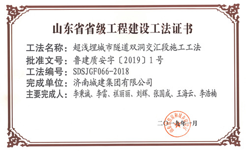 集团“超浅埋城市隧道双洞交汇段施工工法”被评为山东省省级工程建设工法
