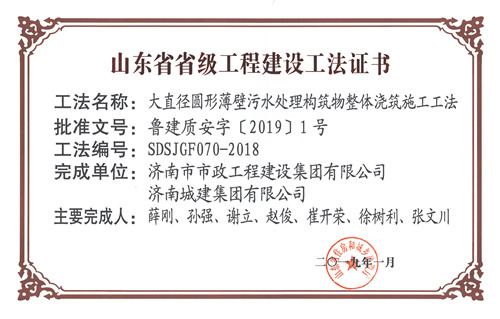 集团“大直径圆形薄壁污水处理构筑物整体浇筑施工工法”被评为山东省省级工程建设工法