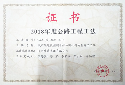集团“城市隧道微型钢管桩加固软弱地基施工工法”被评为2018年度公路工程工法