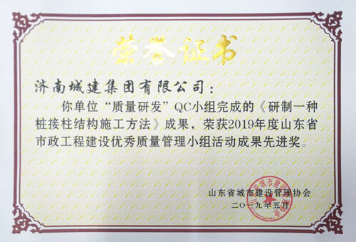 集团“质量研发”QC小组完成的《研制一种桩柱结构施工方法》成果荣获“2019年度山东省市政工程建设优秀质量管理小组活动成果先进奖