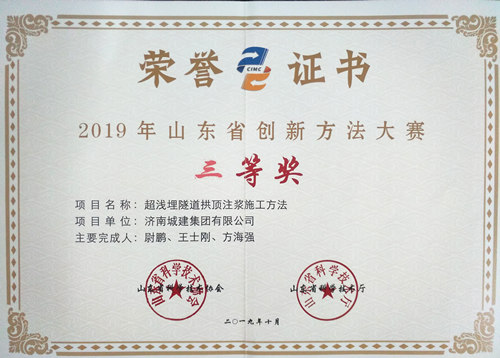 集团《超浅埋隧道拱顶注浆施工方法》荣获“2019年度山东省创新方法大赛三等奖”