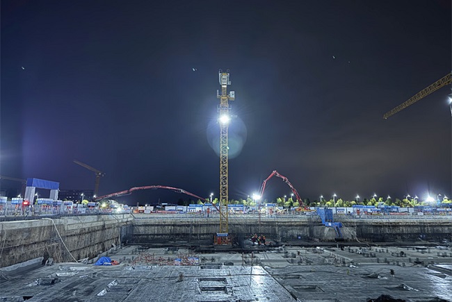 筏板作为建筑工程中至关重要的基础结构,其浇筑质量紧密关联着整个建筑的稳定性与安全性。项目部高度重视,提前进行精心谋划和周密部署,确定各阶段任务目标,明确工作方向,调动员工干事热情,提升管理工作效率,多次召开首件筏板专题会议,全方位筹备此次首件筏板浇筑工作。本次筏板混凝土施工采用了65米和52米两台汽车泵,分别从基坑的西侧和北侧实施浇筑作业,经过16个小时的连续奋战,共计浇筑混凝土1036立方。