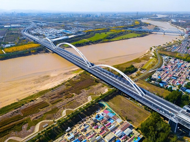 项目全长7.748公里,主桥设计为双塔双索面钢桁梁斜拉桥,与既有黄河公路大桥并行建设,是万里黄河第一座不等跨并桥建设工程。新老桥桥面高差24米,中心间距33.5米,主跨跨径与老桥主桥等长,刷新“跨黄”桥梁纪录。项目预留轨道交通7号线,建成后,将完全实现城市主干路、城市快速路、轨道交通、高速公路及国家干线公路的交通转换。