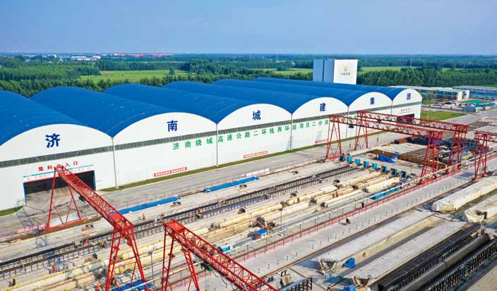 近年来,以装配式为核心的建筑产业化快速发展,成为加快施工效率、提升企业全产业链整合能力、增强市场竞争力的重要推动力。集团以大西环项目为试点,遵循“因地制宜、节约土地、保护环境、安全可靠”的原则,投资 8000 万元建设济南绕城高速公路二环线西环段项目预制场站。预制场站占地面积约 180 亩,以信息管理、集约化管理为依托,高标准合理规划场站布局,划分出制梁区、钢筋加工区、存梁区、保障区、提梁上桥区(装车区〉和办公生活区等区段,各区段布局合理,功能完备。其中,预制台座总体布局为南北方向,共分为 3个预制区,每个预制区左侧为两槽纵向排列预